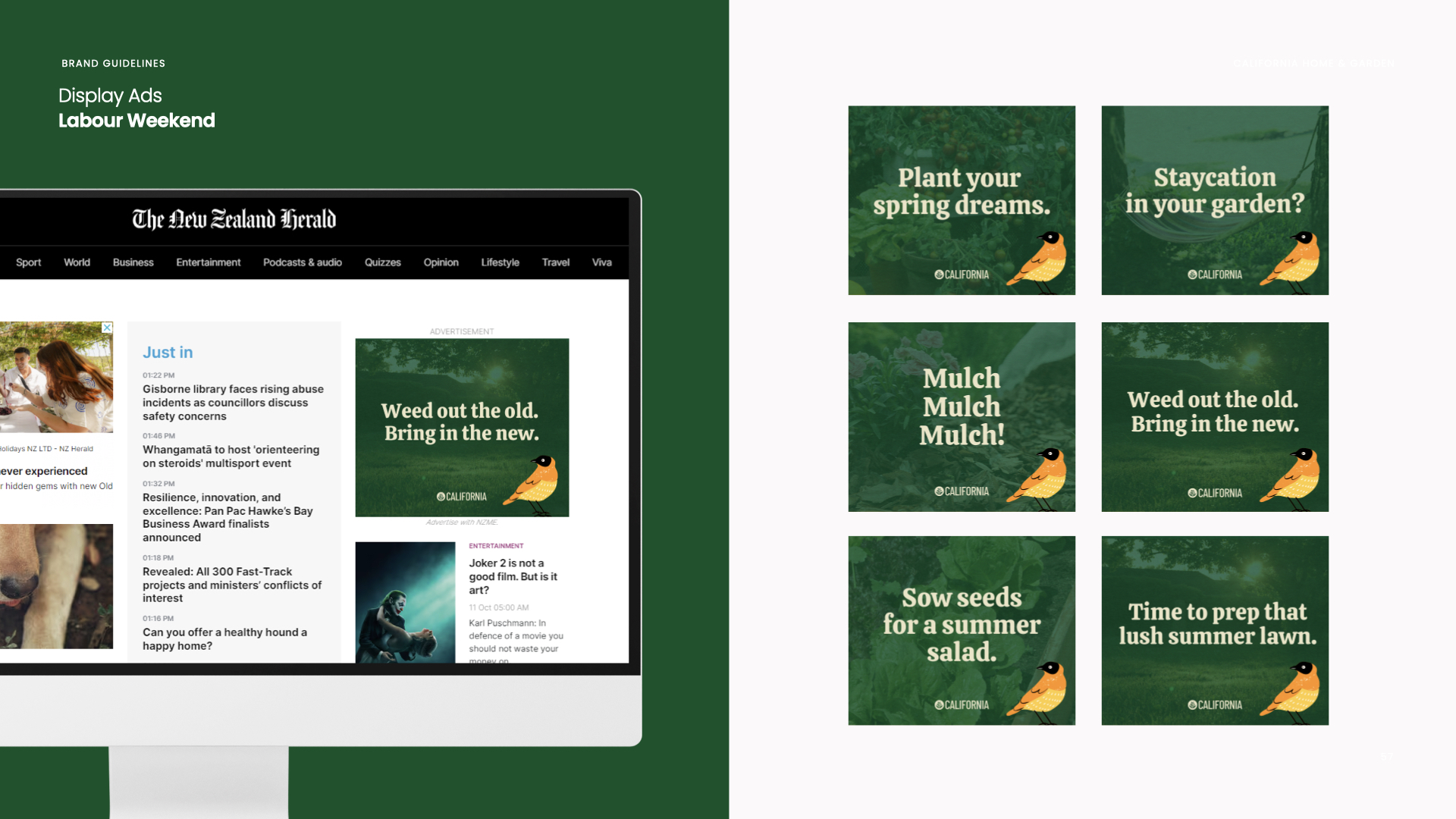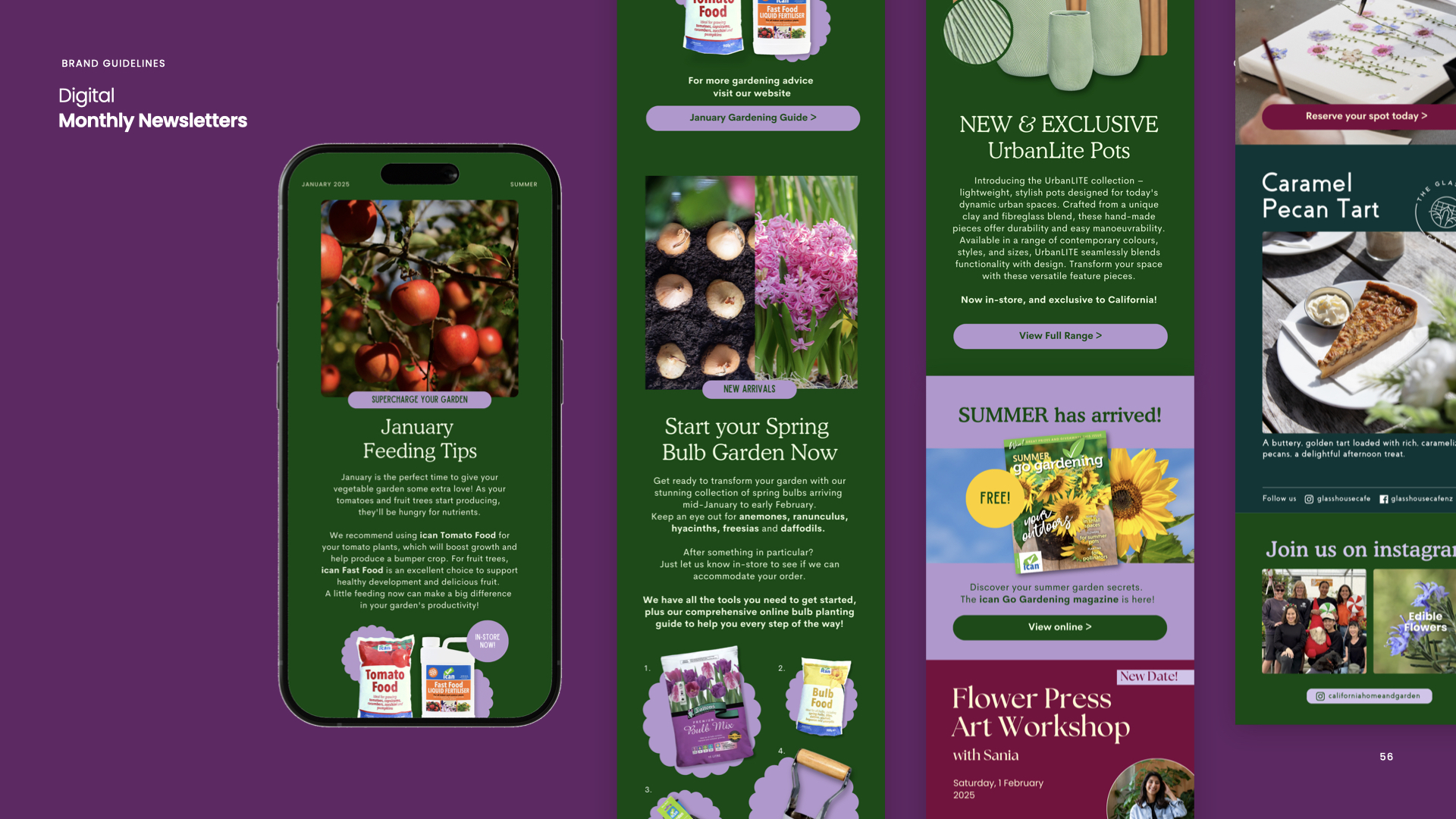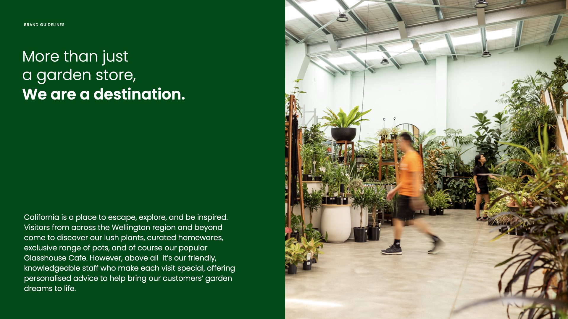 California Home & Garden, a charming family-run garden centre in the heart of Lower Hutt, has become a beloved destination for locals seeking personalised service, curated products, and a cozy in-house café. To stand apart from large chain stores and create a truly engaging experience, I developed a distinct brand voice that reflects the business’s friendly, community-focused ethos. All marketing materials were thoughtfully crafted to prioritise customer care, ensuring that shoppers felt well-informed and inspired. From playful signposts in the green spaces to clear in-store wayfinding and lively Instagram reels, the messaging consistently embraced a vibrant, approachable tone, encouraging customers to explore and enjoy gardening through every season.